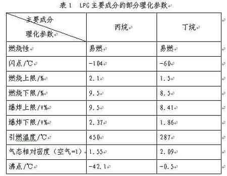 液化石油氣蒸汽的主要組成成分為丙烷、丁烷、丙烯、丁烯等混合物。它們?cè)诔爻合聻闅怏w,只要稍加一點(diǎn)壓力就可以液化。其密度是隨壓力及溫度改變而改變,比重則視其成分而變,一般為空氣的1.5—1.75,常滯留于低洼處。表1列出了LPG主要成分的部分理化參數(shù)。