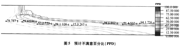從圖5可以看出,PPD先逐漸變小,后又逐漸增大,筆者認為,入口處的風速較大,在離火源區較遠處出現了人體感覺“偏冷”的現象,而隨著氣流不斷接近火源區,吸收了火源區所擴散出來的溫度,氣流得到了升溫,人體感覺逐漸地由冷至適中,所以在一定范圍內PPD值得到了減小。