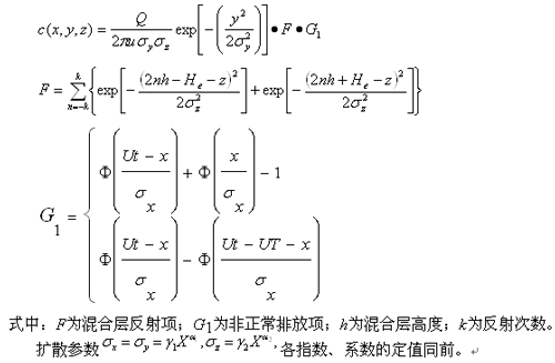 以排氣筒地面位置為原點,有效源高為He,平均風向軸為X軸,源強為Q(mg/s),開始非正常排放時的時間為t',非正常排放持續(xù)時間為T,預測時刻的時間為t。t時刻任一點(x,y,z)的濃度,以持續(xù)排放源模式為基礎,乘上一個系數(shù)G1,按下式計算: