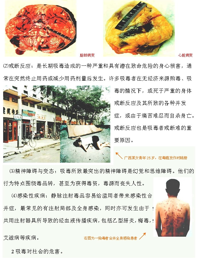 ⑴吸毒對身體的毒性作用: 毒性作用是指用藥劑量過大或用藥時間過長引起的對身體的一種有害作用,通常伴有機體的功能失調和組織病理變化。毒品可對人體神經、內分泌和免疫三大系統以及各組織器官的功能代謝和結構會造成嚴重損害。吸毒會產生對中樞神經系統的抑制,減慢呼吸頻率,降低肺功能,導致人體缺氧,產生肺水腫,最終因呼吸衰竭致人死亡;吸毒會影響植物神經功能,引起腦部化學物質改變、神經功能紊亂、智能減退、血液循環障礙、胃腸功能紊亂等,從而導致頭痛、抽搐、胃腸絞痛等毒副作用;吸毒可直接損害人體免疫功能,使人容易感染疾病;女性吸毒者有閉經、痛經和排卵停止,妊娠婦女可導致早產、畸胎或胎兒死亡,若胎兒幸存也已成為毒品間接依賴者。下圖為心臟及大腦的病變圖片: