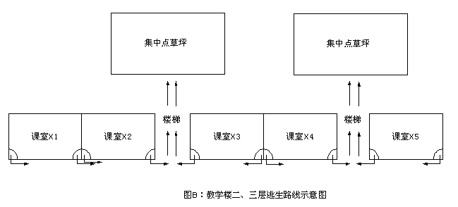 3)二樓、三樓教室的學(xué)生按圖B線路經(jīng)過走廊進(jìn)入樓梯向一樓(二樓)撤離,請(qǐng)記住下樓梯時(shí)自己是走左邊還是走右邊,不要錯(cuò)走,也不要在中途改換方向,直至集中點(diǎn)。