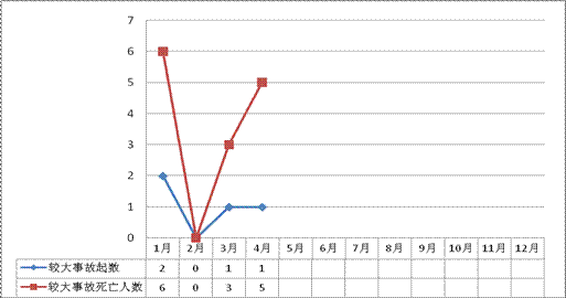 2011年4月,全國共發生房屋市政工程生產安全較大事故1起、死亡5人,比去年同期事故起數減少1起、死亡人數減少1人,同比分別下降50.00%和16.67%。