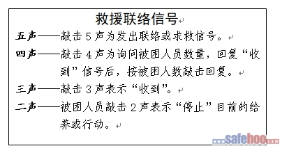 五聲——尋求聯絡(被困人員敲擊5聲為求救信號;救援人員敲擊5聲為尋求聯絡信號)。