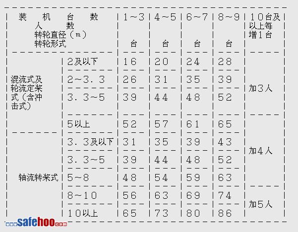 (5)同一廠房?jī)?nèi)安裝不同轉(zhuǎn)輪直徑機(jī)組的,按其最大直徑的標(biāo)準(zhǔn)計(jì)算定員。