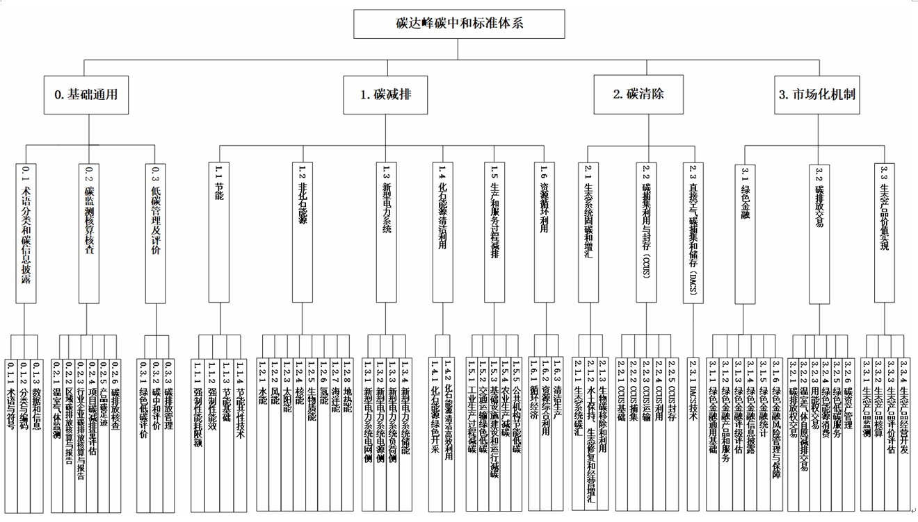 碳達峰碳中和標準體系包括基礎通用標準子體系、碳減排標準子體系、碳清除標準子體系和市場化機制標準子體系等4個一級子體系,并進一步細分為15個二級子體系、63個三級子體系。該體系覆蓋能源、工業、交通運輸、城鄉建設、水利、農業農村、林業草原、金融、公共機構、居民生活等重點行業和領域碳達峰碳中和工作,滿足地區、行業、園區、組織等各類場景的應用。本標準體系根據發展需要進行動態調整。