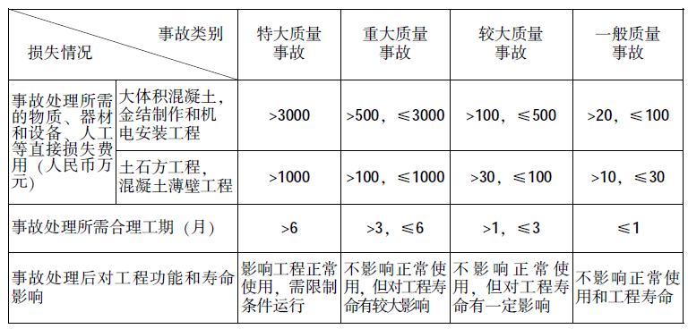 第七條 工程質量事故按直接經濟損失的大小,檢查、處理事故對工期的影響時間長短和對工程正確使用的影響,分為一般質量事故、較大質量事故、重大質量事故、特大質量事故。