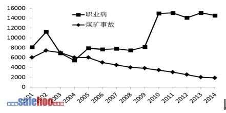 隨著社會經濟和文明的進步與發展,人們愈來愈認識到社會進步與經濟發展處于同等重要的地位。經濟發展的最終目的不僅僅是創造財富,更重要的是使人們過上高質量的生活。經濟的發展不應以犧牲勞動者的健康作為代價,煤礦生產和煤礦職業病防控同樣重要。近年來,我國煤礦安全生產工作取得了明顯成效,實現了持續穩定好轉,生產安全事故死亡人數實現了連續多年快速下降,但職業健康工作面臨的形勢仍針分嚴峻。2004年以來,煤礦事故死亡人數穩步下降,而煤礦職業病報告病例卻未見下降,特別是2009年以來增速明顯加快,2013年煤礦職業病報告病例達15078例,是同年煤礦事故死亡人數的14倍(見圖1)[2]。