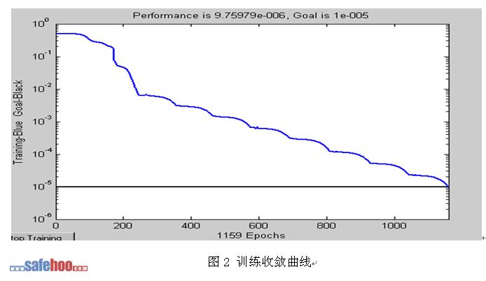 從表礦井水質臺賬中選擇26組水樣,其中第四系下組水11組,3煤層頂板砂巖裂隙水10組,三灰水作為BP人工神經網絡訓練樣本,為了消除綱量的影響,對原數據進行歸一化處理,見表1。經過1159次迭代后MSE = 1.0e-005, 達到精度要求, 訓練結束,見圖2。