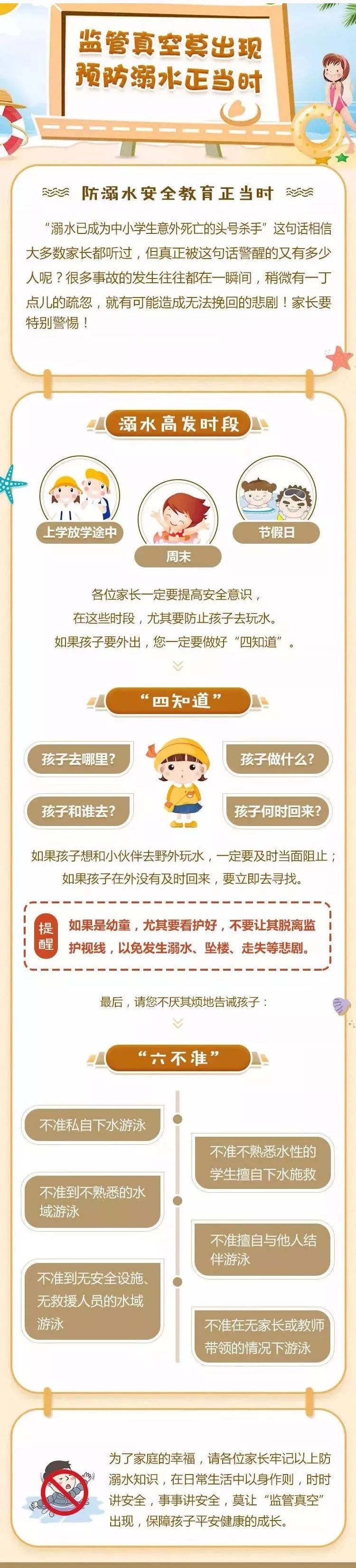 暑期來了,有些娃娃們玩性大發(fā),這幾天,宅家看電視、玩游戲怕是已經(jīng)滿足不了他們了!恨不得趕緊套上游泳圈,盡情展示自己的水中技藝!所以,小編在這里提醒親愛的爸比、媽咪們,請務(wù)必做到以下幾點(diǎn),以防“小吞金獸們”溺水,釀大禍: