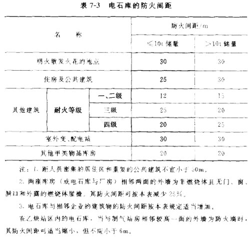 電力牽引機車的廠外鐵路的防火間距可減為20m。至電石庫的裝卸專用鐵路線和道路的防火間距,可不受上列規定的限制。
