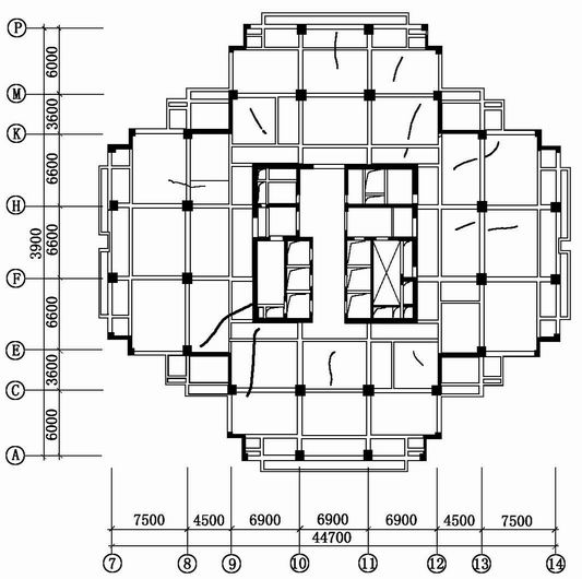 西北地區(qū)某高層綜合辦公樓,主樓為鋼筋混凝土框-筒結(jié)構(gòu),地下1層,地上18層,總高度76.8m,總建筑面積36482m2。該建筑基礎(chǔ)為灌注群樁,地下室外墻采用300mm厚C30自防水混凝土。標(biāo)高13.6m以上混凝土標(biāo)號(hào)均為C40,樓板厚度120mm,其標(biāo)準(zhǔn)層平面結(jié)構(gòu)見(jiàn)圖1。