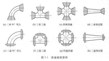 普通灰鑄鐵管件主要有彎頭(90°、60°、30°及10°)、三通、四通和異徑管(俗稱大小頭)等,使用時(shí)主要采用承插式連接、法蘭連接和?昆合連接。圖7—l是普通鑄鐵管件。