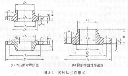 (2)凹凸面法蘭? 如圖3—2(a)所示,一對(duì)法蘭的密封面分別做成凹面和凸面,凸面嵌人凹面,中間使用密封墊片。其優(yōu)點(diǎn)在于能鉗住墊片防止被吹出,但不能保護(hù)墊片不被擠入管中。一般使用在操作壓力較大的情況。
