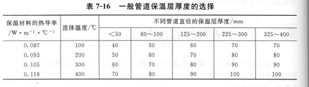 保溫層的厚度計算比較復雜,一般可以根據保溫材料、熱導率、介質溫度及a管徑來確定。也可以參照表7—16進行選擇。