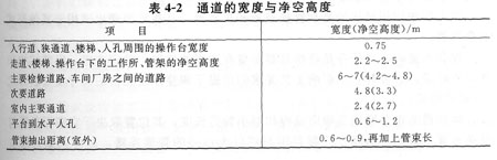管廊一般沿通道布置(在通道上空或通道兩側),供工藝、公用工程、儀表管道、電纜共同使用。因此,要求通道應直而簡單地形成方格。通道的寬度與凈空高度見表4—2。