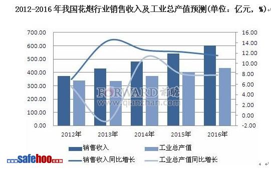 2012-2016年我國花炮行業銷售收入及工業總產值預測(單位:億元,%)