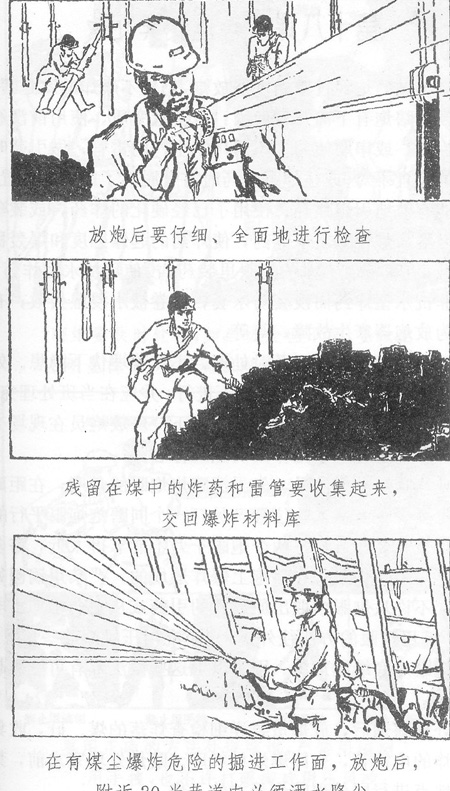 放炮后,放炮員和班組長還必須巡視放炮地點,檢查通風、瓦斯、煤塵、頂板、支架、瞎炮、殘爆等情況。采掘工作面的瓦斯濃度和各種有害氣體如超過了規定,要加強通風,稀釋后才能進入。在有煤塵爆炸危險的煤層中,掘進工作面放炮后,附近20米的巷道內必須灑水降塵。還要檢查工作面支架有無崩倒、崩壞的,煤壁和頂板是否完好,如有危險情況,必須立即處理。放炮后工作面殘留在煤中的炸藥和雷管要收集起來,妥善保管。下班后,連同剩余爆炸材料——塊交回爆炸材料庫。