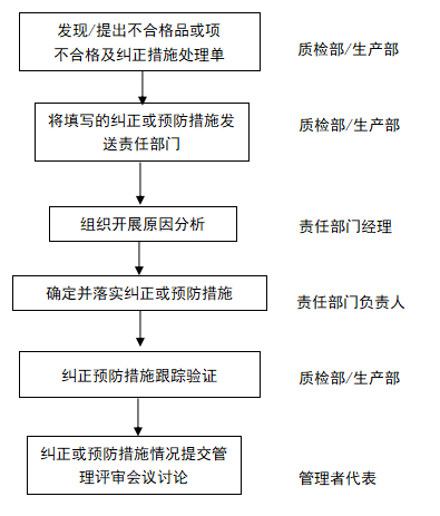 4.2.2質(zhì)檢部和生產(chǎn)部為公司產(chǎn)品不合格糾正/預防措施主管部門,負責對實施糾正/預防措施的監(jiān)督管理,并驗證其有效性;