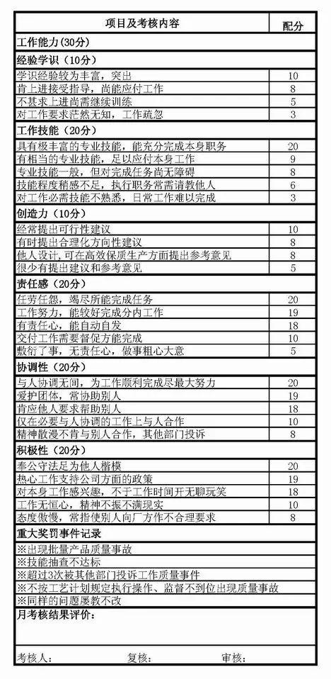1.2.1月度考核:每月底各級主管對所屬員工應就其工作效率,操行,態度,技能及出勤狀況,獎懲,教育訓練缺席等進行考核;