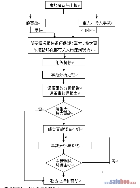 6.1.2特大或重大設備事故發生,發生部門必須在一小時內向裝備環保部報告簡要情況,裝備環保部應立即向主管副總經理報告,并到現場組織事故處理工作。事故所在部門必須在設備修復后一周內上報“設備事故分析報告”。