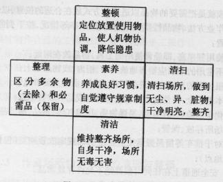 ??? 是日本企業采用的安全管理方法,所謂5S是“整理;整頓、清掃、清潔、素養”(如圖1所示)5個首位漢字的日語拉丁語的第一個字母。其實質就是從保持作業場所的整潔、有序來保證安全生產。與我國70年代后期在企業里提倡的“文明生產”基本相同。整理,區分多余物和必需品,并且去掉前者。工作場地變寬裕,工作秩序易保持,廢存積壓物可消除;