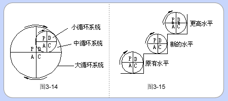 1. 大循環套中循環,中循環套小循環,環環轉動,相互促進。一個企業或單位是一個PDCA大循環系統;內部的各部門或處室是一個中循環系統;基層小組或個人是一個小循環系統。這樣,逐級分層,環環扣緊,把整個計劃工作有機地聯系起來,相互緊密配合,協調地共同發展。如圖3-14。