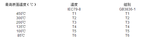 這是與氣體點燃溫度有關的電氣設備(假定環境溫度為40℃時)的最高表面溫度,點燃能量與點燃溫度無關。在標準BS5345第一部分中列出了所有可燃性氣體和其組別。