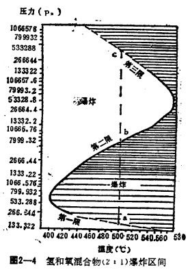 圖中a和b點時的壓力,即200Pa和6666Pa是混合物在500℃時的爆炸低限和爆炸高限。隨著溫度增加,爆炸極限會變寬。這是由于鏈反應需要有一定的活化能,鏈分支反應速度隨溫度升高而增加,而鏈終止的反應卻隨溫度的升高而降低,故升高溫度對產生鏈反應有利,結果使爆炸極限變寬,在圖上呈現半島型。當壓力再升高超過c點(大于666610Pa)時,開始出現下列反應: