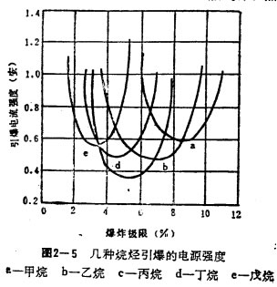 對于每一種可燃氣體(蒸氣)的爆炸性混合物,都有一個引起爆炸的最小點火能量,低于該能量,混合物就不爆炸。從圖2—5可以看出,引起烷烴爆炸的電火花的最小電流強度分別為:甲烷0.57A,乙烷0.45A,丙烷0.36A,丁烷0,48A,戊烷0.55A。