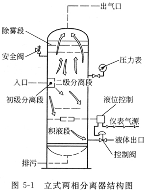 立式重力分離器的主體為一立式圓筒體,氣流一般從該筒體的中段進(jìn)入,頂部為氣流出口,底部為液體出口,結(jié)構(gòu)與分離作用如圖5-1。