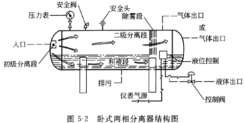 臥式重力式分離器的主體為一臥式圓筒體,氣流從一端進(jìn)入,自另一端流出,其作用原理與立式分離器大致相同,由圖5-2所示,可分為下列部分。