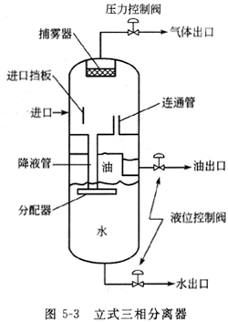 圖5-3表示一個(gè)典型的立式三相分離器結(jié)構(gòu)。流體經(jīng)過(guò)側(cè)面的入口進(jìn)入分離器,在進(jìn)口擋板處,流體分離出大量氣體。分離出的液體經(jīng)降液管輸送到油氣界面處而不影響撇沫。連通管上下的壓力通過(guò)連通管平衡。油氣水混合物經(jīng)降液管出口處的分配器進(jìn)入油水界面,氣體從此處上升,油水也由于重力的原因分別向上向下運(yùn)動(dòng)從而最終達(dá)到分離油氣水的目的。