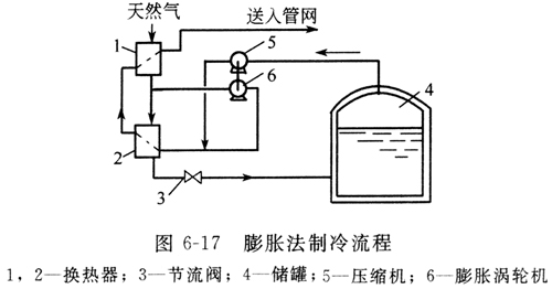 如圖6-17所示,膨脹法制冷流程是充分利用長輸干管與用戶之間較大的壓力梯度作為液化的能源。它不需要從外部供給能量,只是利用了干管剩余的能量。這種方法適用于遠程干管壓力較高、且液化容量較小的地方。來自長?天然氣??? 送入管網(wǎng)輸干管的天然氣,先流經(jīng)換熱器1,然后大部分天然氣在膨脹渦輪機中減壓到輸氣管網(wǎng)的壓力。沒有減壓的天然氣在換熱器2中被冷卻,并經(jīng)節(jié)流閥3節(jié)流膨脹,降壓液化后進入儲罐4。儲罐上部蒸發(fā)的天然氣,由膨脹渦輪機帶動的壓縮機吸出并壓縮到輸氣管網(wǎng)的壓力,并與膨脹渦輪機出來的天然氣混合作為冷媒,經(jīng)換熱器2及1送入管網(wǎng)。