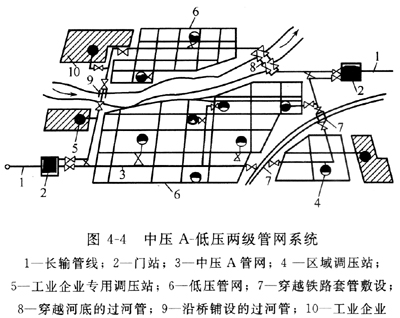 ③ 高壓供氣方式和高-中-低三級管網系統。高-中-低三級管網系統如圖4-5,氣源來自長輸管線的高壓天然氣從天然氣門站經調壓、計量后輸出,進入城市高壓管網,然后經區域高-中壓調壓器調至中壓,輸入中壓管網,再經區域中一低調壓器調成低壓,由低壓管網供應天然氣用戶。