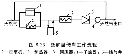 如果儲(chǔ)庫(kù)的壓力和管線壓力相等,則必須使天然氣經(jīng)壓縮機(jī)加壓,使它達(dá)到需要的壓力送入儲(chǔ)庫(kù),而儲(chǔ)庫(kù)則靠自身的壓力將天然氣輸出。輸出的天然氣在進(jìn)調(diào)壓器前也需經(jīng)過預(yù)熱器。此外,至少在儲(chǔ)氣庫(kù)工作的第一年中,還需要將含有鹽水的天然氣進(jìn)行干燥處理。