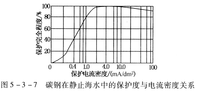 ??? 一般陰極保護的效果隨外加陰極電流的增大而增高,但并非按比例提高;當電流密度增大到一定程度后,再繼續增加電流密度還會降低保護度。如圖5-3-7,碳鋼在靜止海水中,當i保=2mA/dm2時,已接近完全保護,如果將保護電流密度增大到62mA/dm2以上,則保護度