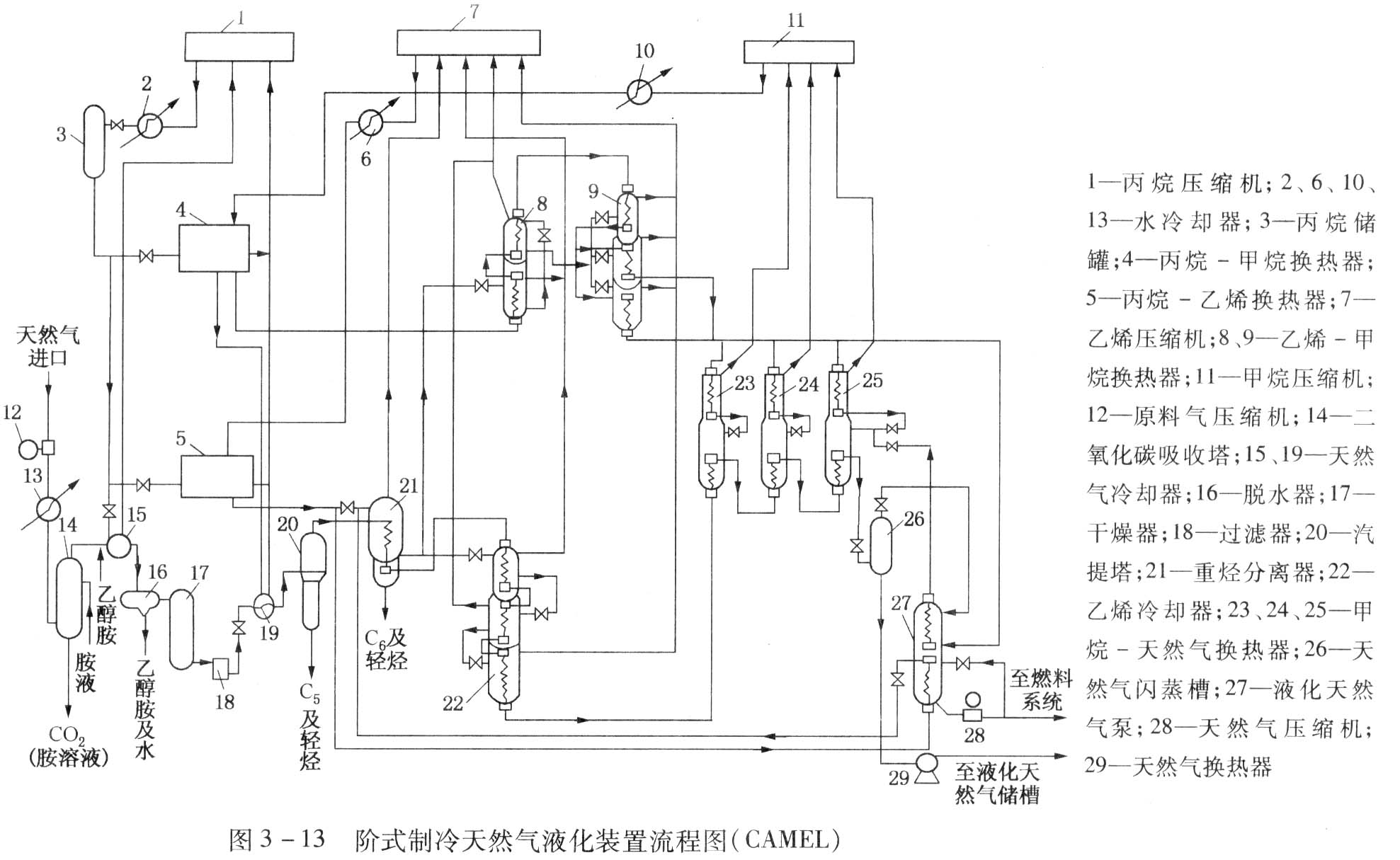 1961年,在阿爾及利亞建造的世界上第一座大型基本負荷型天然氣液化裝置(CAMEL),采用丙烷、乙烯和甲烷組成的階式制冷液化流程,見圖3-13[7]。于1964年在阿爾及利亞Arzew交付使用。該液化工廠共有三套相同的液化裝置。每套裝置液化能力為1.42×106m3/d。