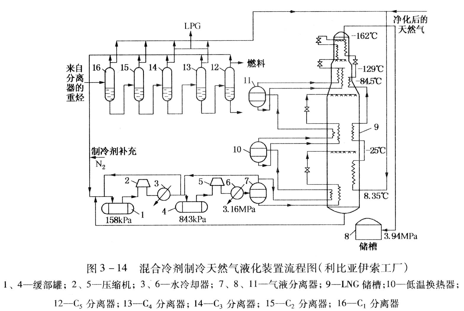 混合制冷劑液化流程有開式和閉式兩種。閉式混合制冷劑液化流程是指制冷劑循環與天然氣液化過程彼此分開的液化流程。圖3-14[7]為采用閉式混合制冷劑液化循環的天然氣液化裝置示意圖。這套裝置是1970年恢復運轉的利比亞伊索工廠的液化裝置。