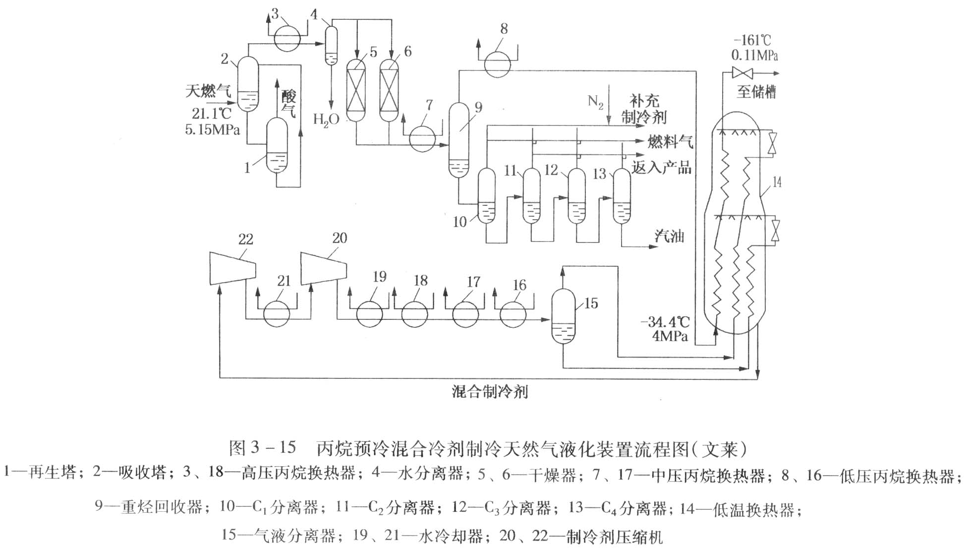 圖3-15[7]是首次采用這種液化流程的天然氣液化裝置的流程簡圖,于1973年建于北加里曼丹的文萊。該廠共有五套這樣的裝置,每套液化能力為424.5×104m3/d。