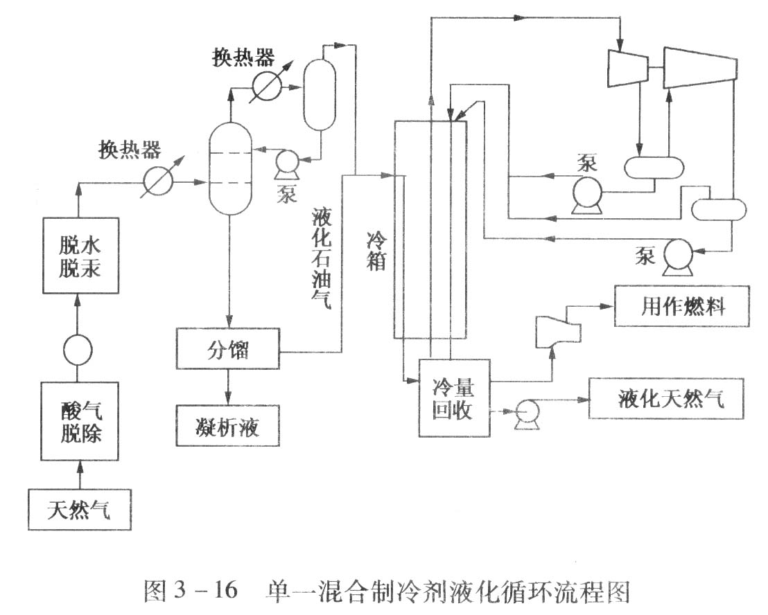 隨著混合制冷劑液化流程的廣泛應(yīng)用,在調(diào)峰型裝置中也越來越多地應(yīng)用這類流程。我國(guó)建造的第一座調(diào)峰裝置(上海浦東LNG調(diào)峰站)就是采用混合制冷劑液化流程。