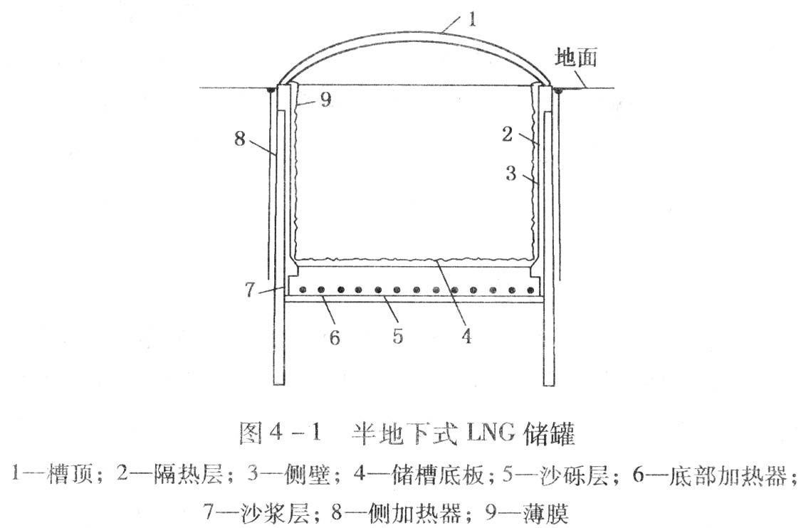 如圖4-1所示,除罐頂外,地下儲罐內儲存的LNG的最高液面在地面以下,罐體坐落在不透水穩定的地層上。為防止周圍土壤凍結;在罐底和罐壁設置加熱器。有的儲罐周圍留有1m厚的凍結土,以提高土壤的強度和水密性。