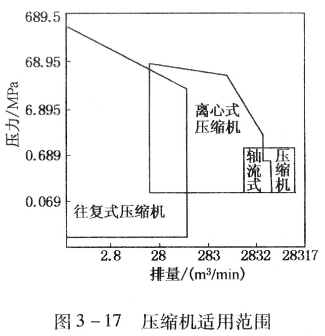 壓縮機在天然氣液化裝置中,主要用于增壓和氣體輸送。對于逐級式液化裝置,還有不同溫區的制冷壓縮機,是天然氣液化流程中的關鍵設備之一。天然氣液化采用的壓縮機,主要有往復式。離心式和軸流式壓縮機。往復式壓縮機通常用于天然氣處理量比較小(100m3/min以下)的液化裝置。軸流式壓縮機組從20世紀80年代開始用于天然氣液化裝置,主要用于混合冷劑制冷循環裝置。離心式壓縮機早已在液化裝置中廣為采用,主要用于大型液化裝置。大型離心式壓縮機的功率可高達41000kW。大型離心式壓縮機的驅動方式除了電力驅動外,還有汽輪機和燃氣輪機兩種驅動方式。各種壓縮機的適用范匿見圖3? -17所示。一般來說,往復式壓縮機適用于低排量、高壓比的情況,離心式壓縮機適用于大排量、低壓比的情況。
