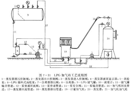 LPG加氣站的流程見圖7-31,成品LPG燃料從生產加工的廠或庫運輸進站。由站內的泵泵入儲氣罐儲存。汽車加氣的工作流程:由儲氣罐9(初壓大約550~900kPa),LPG流體經分離器8沉淀凈化分離后進入渦輪泵6,將流體升高壓力到2.5MPa,輸送給計量加氣機19,在額定的工作壓力下計量計價,注進LPG汽車的氣瓶。