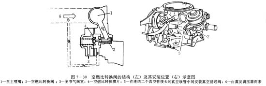 ??? 取下空氣濾清器,用“化油器清潔劑”等清洗混合器,可在短時間內提高混合器的性能(工作響應性好)。但是,反復進行這種作業后,就會在空燃比轉換閥內堆積焦油狀物質。用于營業運行的車輛每年都應從發動機上取下混合器,對空燃比轉換閥充分清洗(圖7-30)。該裝置工作正常的標準為:當切斷一次空氣后,安裝于膜片處的真空度小于19.7kPa時,CO值等于1%±0.2%;或其真空度大于19.7kPa時,CO值小于0.5%。