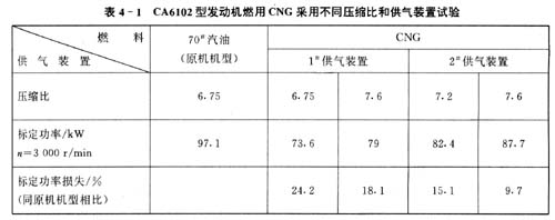 ? 天然氣供氣系統(tǒng)的性能、同發(fā)動機優(yōu)化匹配情況,對天然氣發(fā)動機性能有至關(guān)重要的影響。如表4-1所示,在解放CA6102型汽油機上,采用不同的供氣系統(tǒng)裝置,提高壓縮比,充分證明壓縮比的提高可部分補償發(fā)動機的標定功率損失,而且采用性能優(yōu)良的供氣裝置可使標定功率損失大幅度降低。原機壓縮比為6.75時,采用1#供氣裝置的標定功率損失達24.2%,壓縮比提高到7.6時標定功率損失降為18.1%。而采用2#供氣裝置,壓縮比為7.6時,同原機型相比,標定功率損失可降低到10%左右。