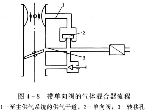 (圖4-8),可以在天然氣干道中壓力低于該系統(tǒng)出口孔處壓力時,防止空氣通過主供氣系統(tǒng)進入怠速系統(tǒng),同時也可在空氣道真空度不夠情況下防止天然氣不受控制地進入混合器空氣道。但是,這個流程需要采用足夠密封的高靈敏度的(即具有不大鎖閉力)單向閥。然而,單向閥在打開時刻前會阻礙天然氣通過主供氣系統(tǒng),從而會使混合氣變稀,并在節(jié)氣閥打開時刻使發(fā)動機工作“間歇”。為彌補“間歇”必須節(jié)氣引進轉(zhuǎn)移孔。