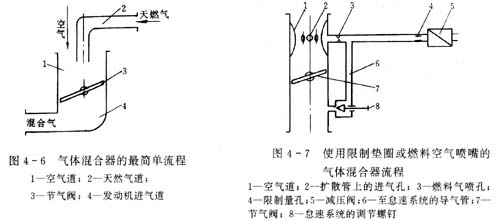 在定量配氣時,空氣和天然氣處于同一聚集狀態(tài),其流量規(guī)律是相近似的,可以比氣液更容易混合成所需比例。因此,混合器最簡單流程如圖4-6所示。但是,實際的減壓閥不能提供這樣的理想條件。減壓閥出口氣壓變化很大,這是由于混合器的流量特征以及氣體總能量的下降所致。氣體總能量下降在其流量小時對壓力影響很大。也就是說,在壓差較小情況下,氣體的準確定量是不可能的。由此得出的結(jié)論是:供給怠速系統(tǒng)和主供氣系統(tǒng)的燃料應(yīng)分別送到混合器擴散管(圖4-7)。這兩個系統(tǒng)的供氣比例可按兩種方法確定:直接在減壓閥出口處使用限制量孔或混合器中的燃料氣噴孔。