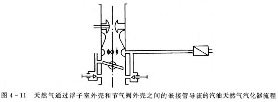(3) 第三種方案是在汽油天然氣汽化器流程中,天然氣通過浮子室外殼和節氣閥外殼之間嵌接管導流(圖4-11)? 該方案的優點是可以最低限度地改變基礎汽化器的部件,主供氣系統和怠速系統之間可直接相連。缺點是與基礎汽化器相比較,它可增加汽油天然氣汽化器的高度,不管是使用天然氣還是汽油都會降低發動機功率,約降低1%~1.5%(是由于要在氣體系統獲得足夠的真空度,必須在安裝嵌接管的地方減少管道口徑,從而引起空氣道中阻力的增加)。