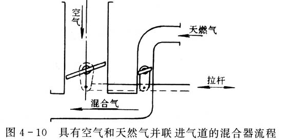 ??? 還有一種較少應用的流程,這種流程就是讓空氣和天然氣同時進入發動機進氣道。在這種情況下,混合氣組成可按相應規律同時打開這兩個進氣道的節氣部件來調節。這種流程如圖4-10所示。