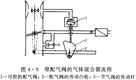 ??? 另一個流程方案是上述混合裝置的進一步發展。這個方案是用閥門配氣,由節氣閥傳動桿來控制配氣閥門(圖4-9),使活瓣式閘門同節氣閥能可靠地同步打開。此方式可達到在怠速方式時,供氣量準確且調節穩定,即使壓力波動大也不會改變混合氣組成,因為天然氣是在極高真空度下進行定量配料。